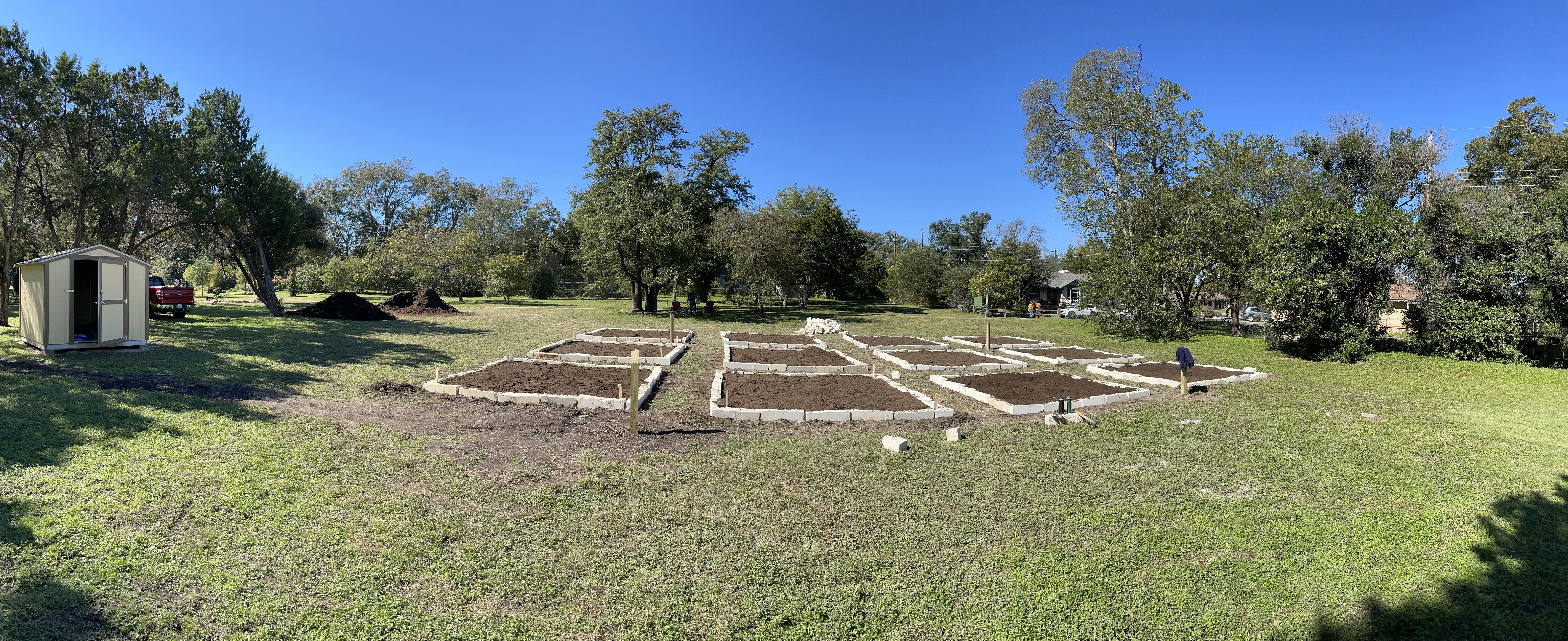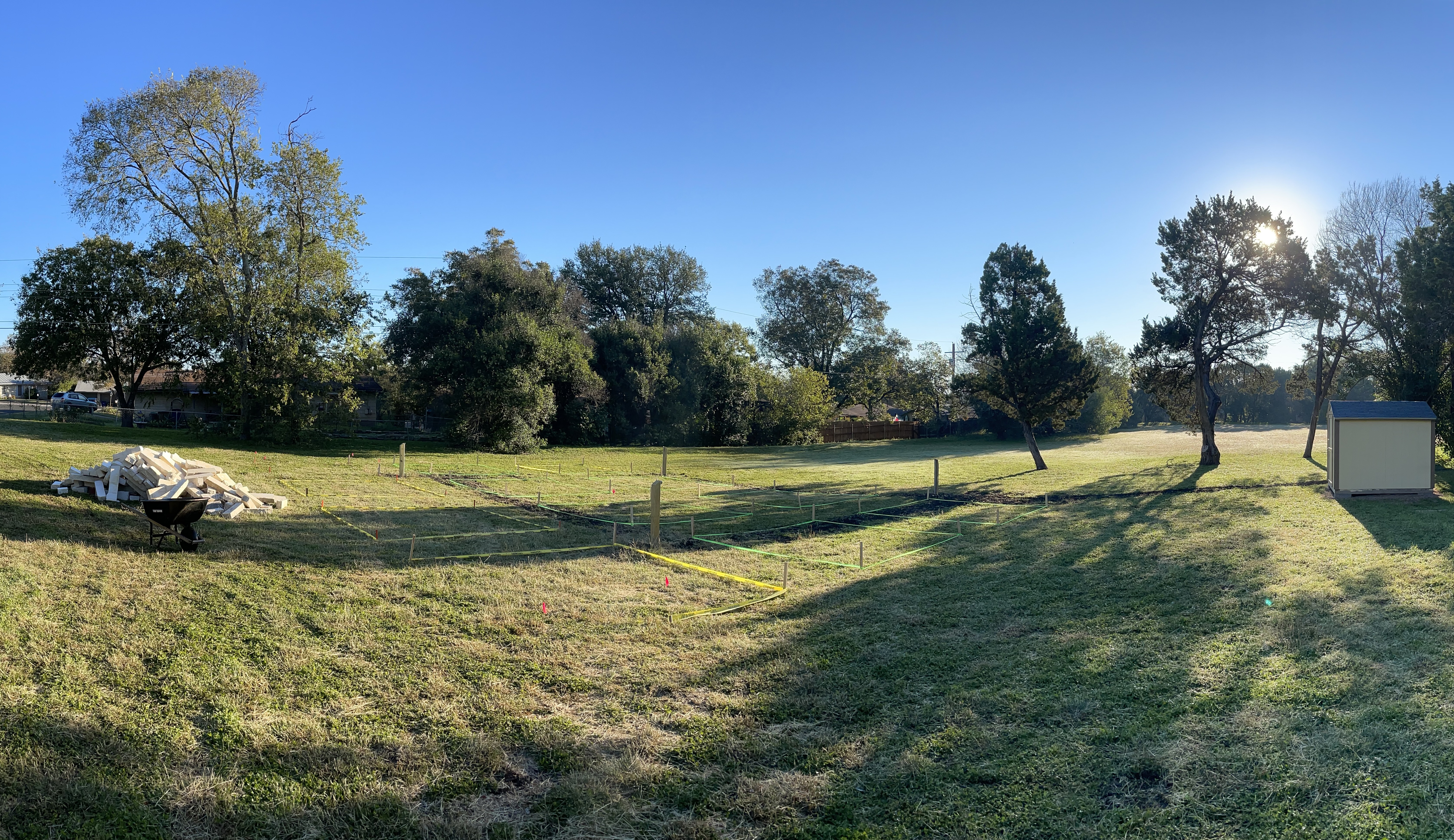 “X marks the spot!” October 16th, 2021; water spigot install October 30th, 2021; followed by organic garden soil and the shed pictured on November 02nd, 2021.