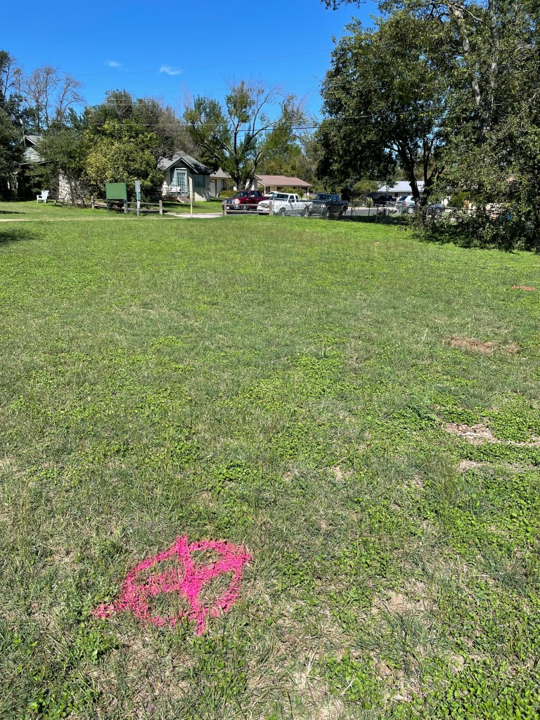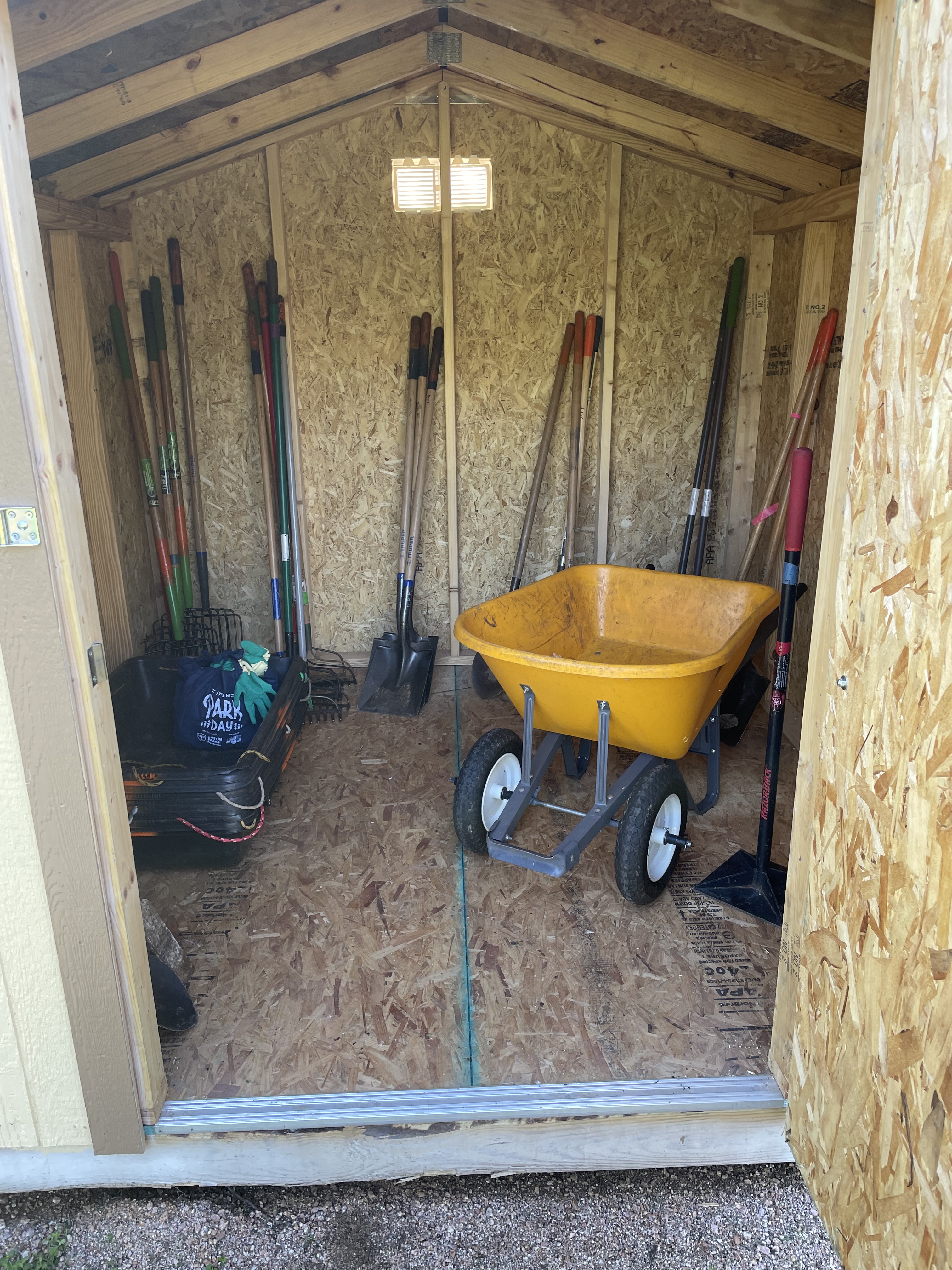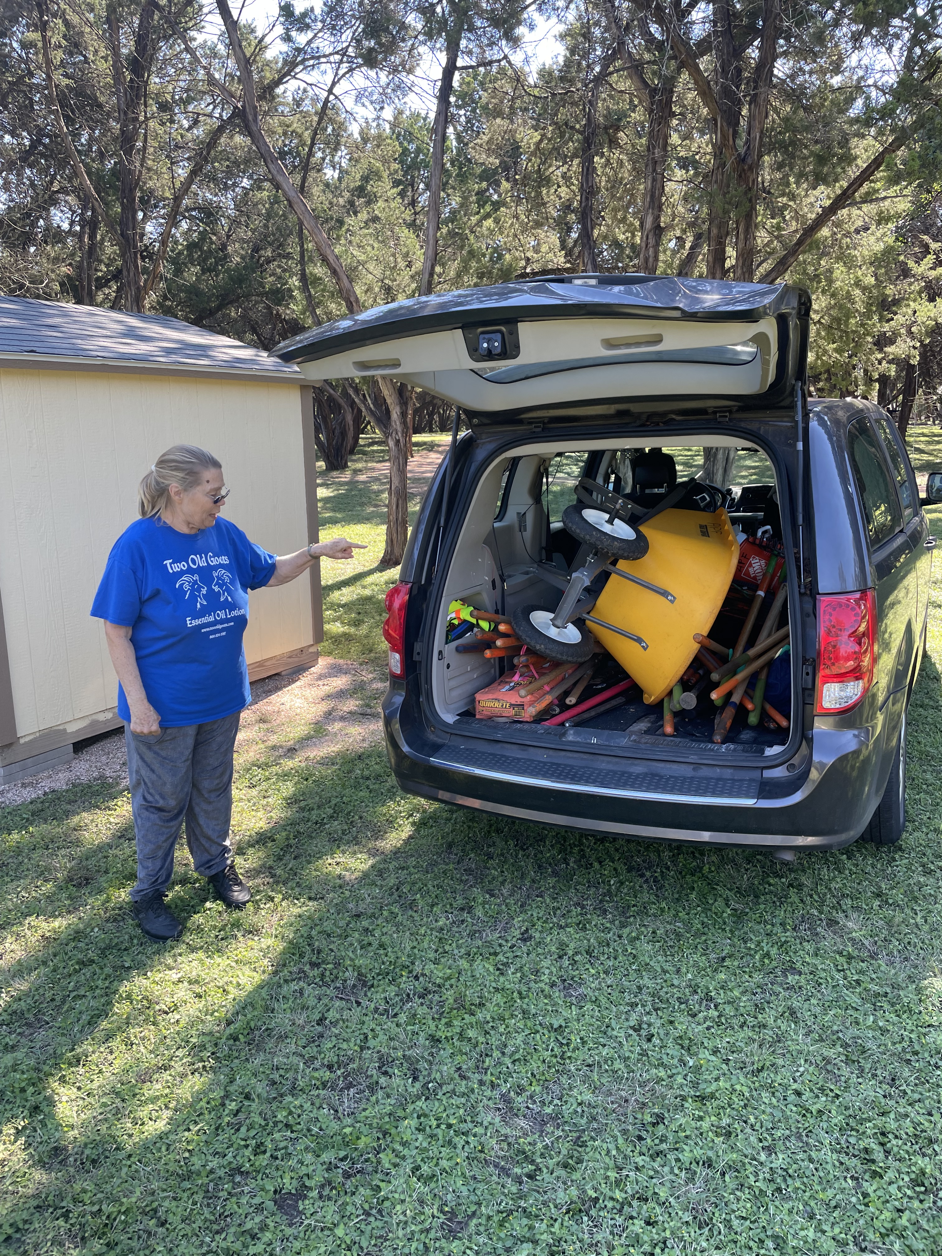 Yvonne pointing to Dan’s minivan filled with tools largely borrowed from the Austin Parks Foundation which were excitedly stored in the new shed on November 5th, 2021 in anticipation of the big day!