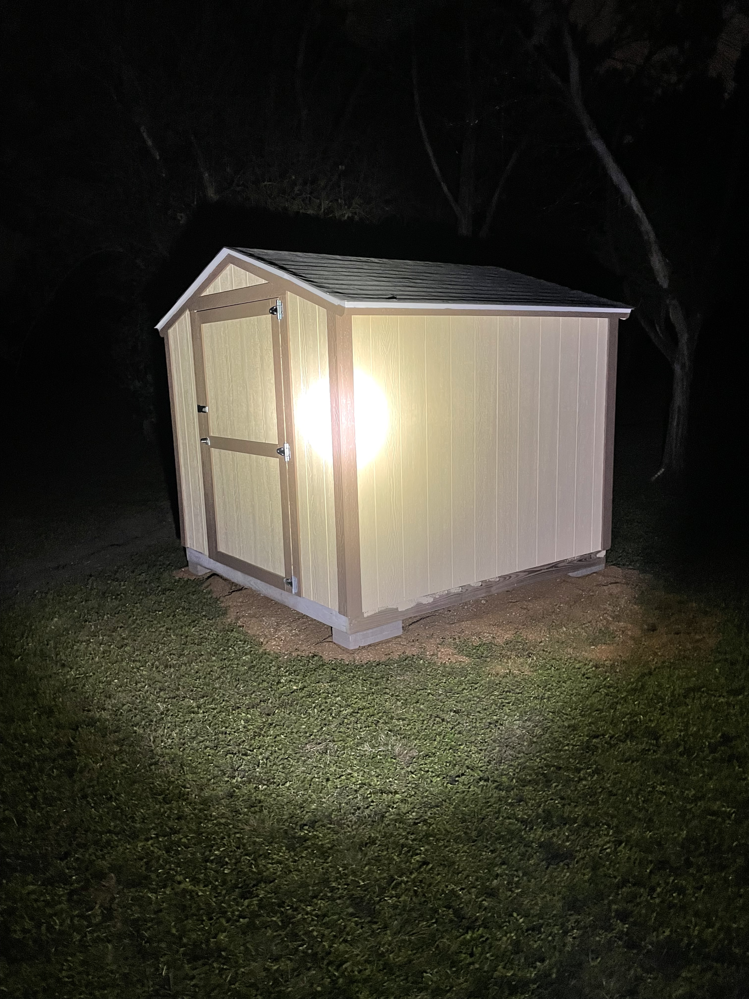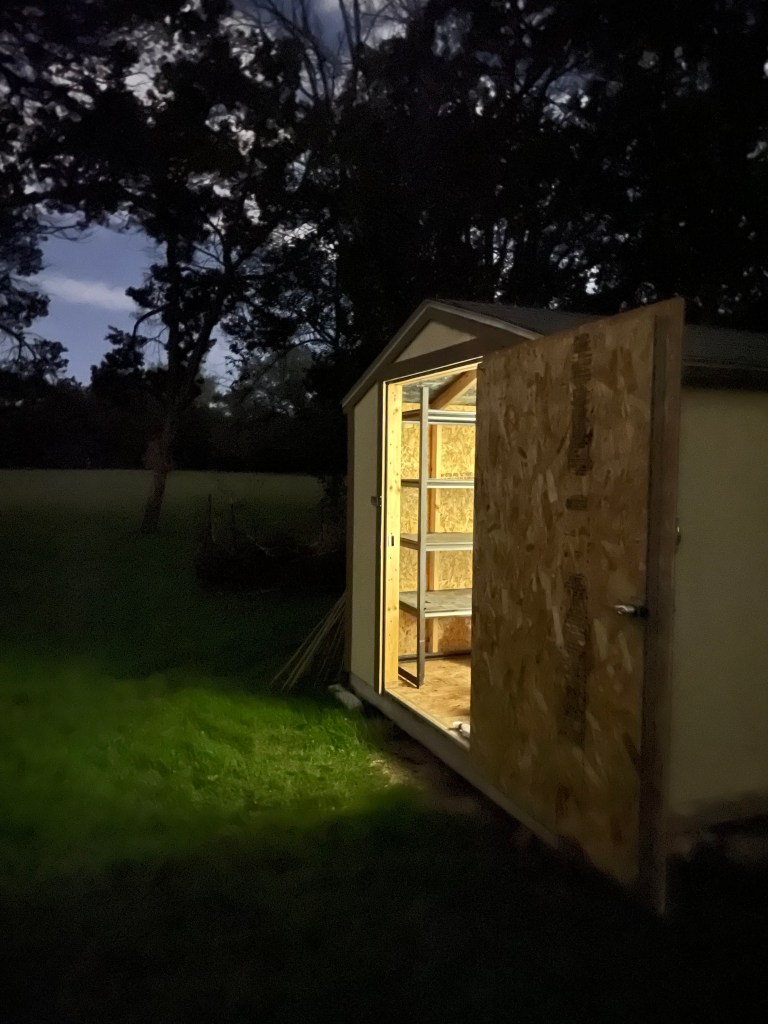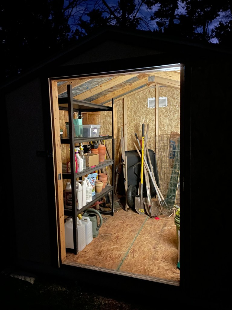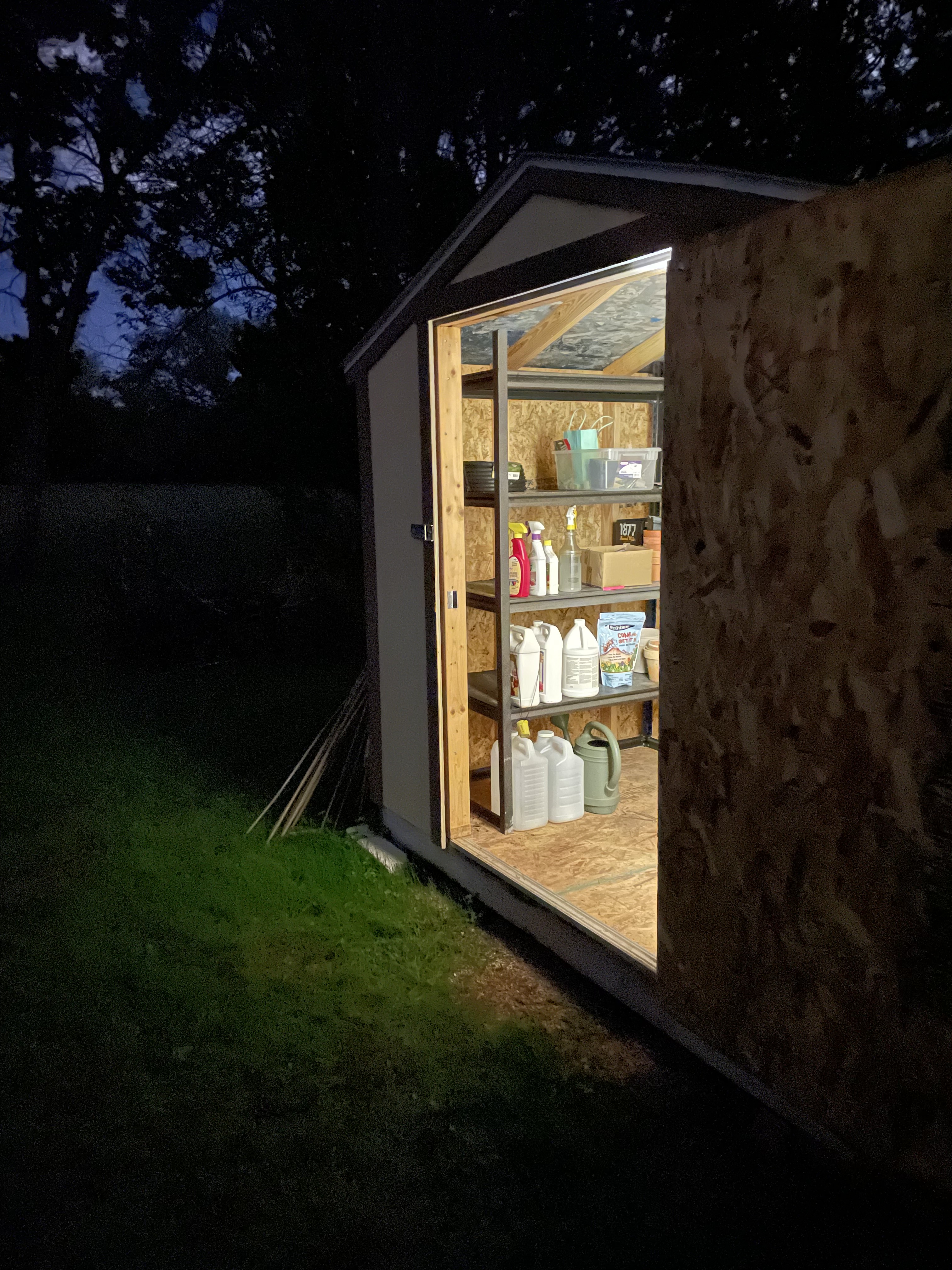 Late-evening shelf donation, shelf assembly, and shed reorganizing by Dan on November 10th, 2022: